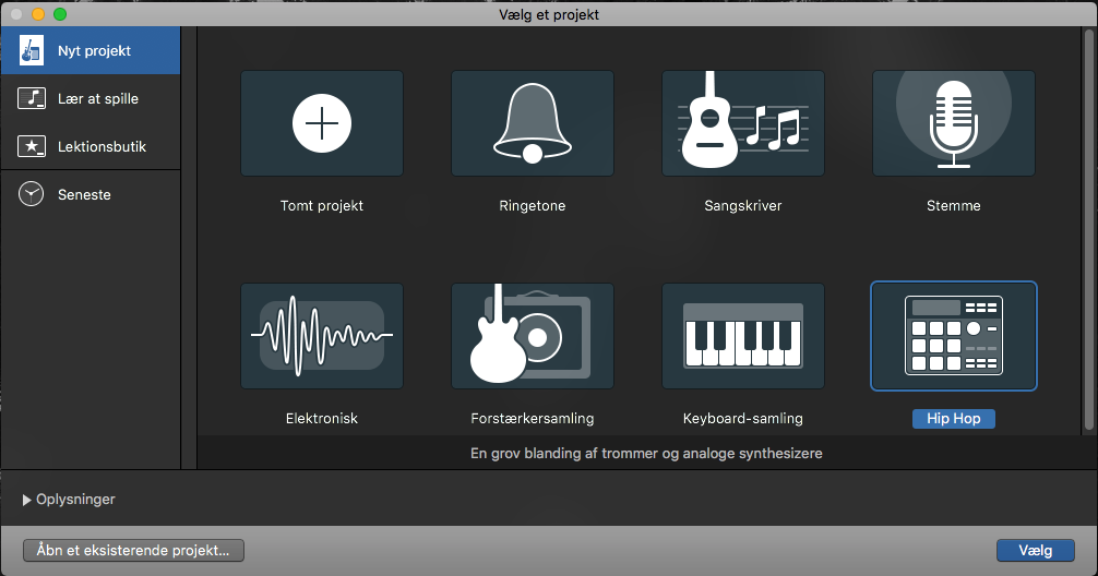 Tomt projekt: Når du opretter et tomt projekt har du mulighed for at, vælge hvordan nummeret skal bygges op. Du får nogle mulighed hvor du kan vælge hvilke instrumenter der skal indgå i dit projekt og det lige fra MIDI input til det store loop bibliotek der også findes i Garageband.